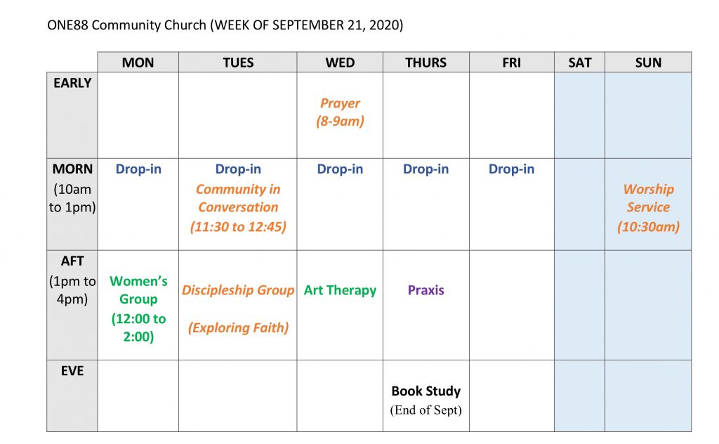 As we have distanced & isolated in order to preserve physical wellness, its becoming clear that we need to pay attention to other aspects of our lives as well. At One88 we seek to create space to foster wellness in all areas of life. To that end, we are introducing a new program called “Living Well.” It is a series of activities & events that seek to address the whole of us, creating space for the Spirit to work in our lives.