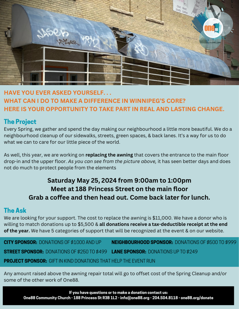 Dear One88 Community: Whether it be providing warm clothes, a meal, a hot shower, or a safe space, we invite you to give to the work of One88 this Christmas as we walk alongside people in downtown Winnipeg.